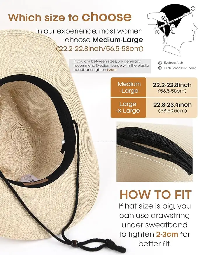 - Adjustable size:There are 2 sizes are available,size Medium-Large suits head circumference 22.2-22.8in(56.5-58cm),size Large-X-Large suits head circumference 22.8-23.4in(58-59.5cm),if you feel too loose or too tight,you could adjust it with strap on the inside of the hat.Wind Lanyard keep tighten on those windy days without any effort