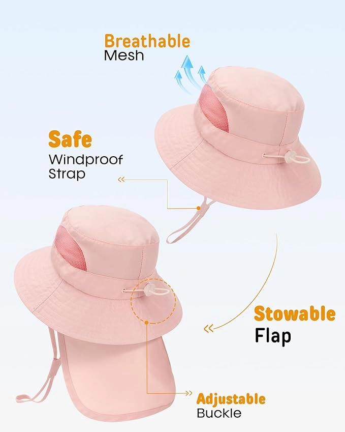 - Foldable and Portable: Baby sun hat with neck flap folds flat for easy storage in diaper bags and is wrinkle-resistant, maintaining its shape after multiple folds