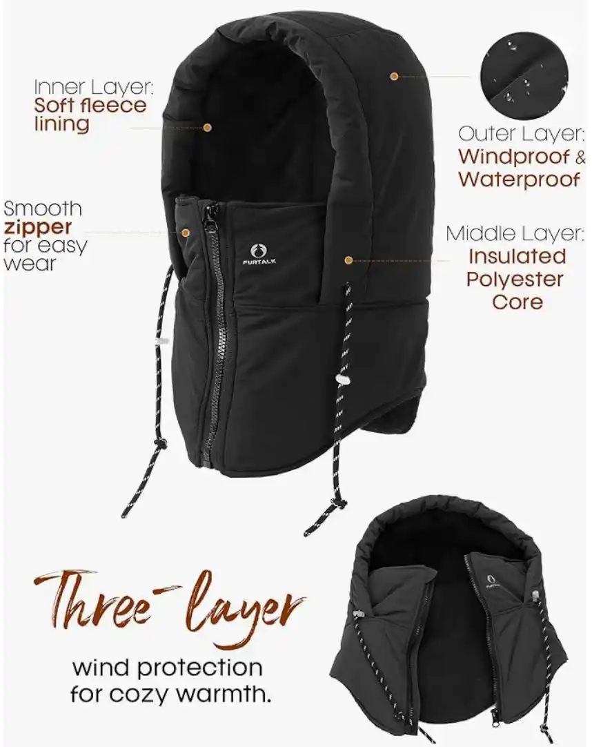 - Multiple Wearing Styles: Can be worn as a full face mask, neck warmer, or hood; falls back nicely when used as a hood for versatile coverage.